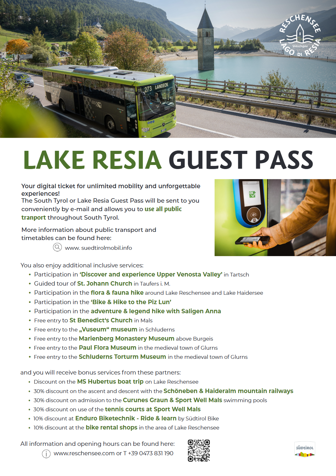 With the Lake Resia Guest Pass, you can enjoy free travel throughout South Tyrol, as well as many leisure and cultural offers.